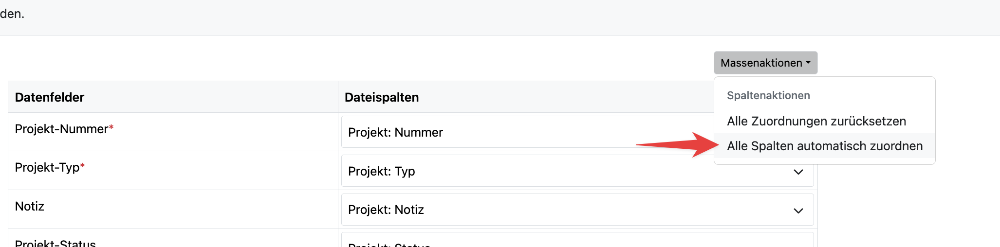 Tipp: Du kannst die Dateispalten den Datenfelder auch automatisch zuweisen lassen. Prüfe bitte anschließend ob sie auch korrekt zugewiesen wurden.