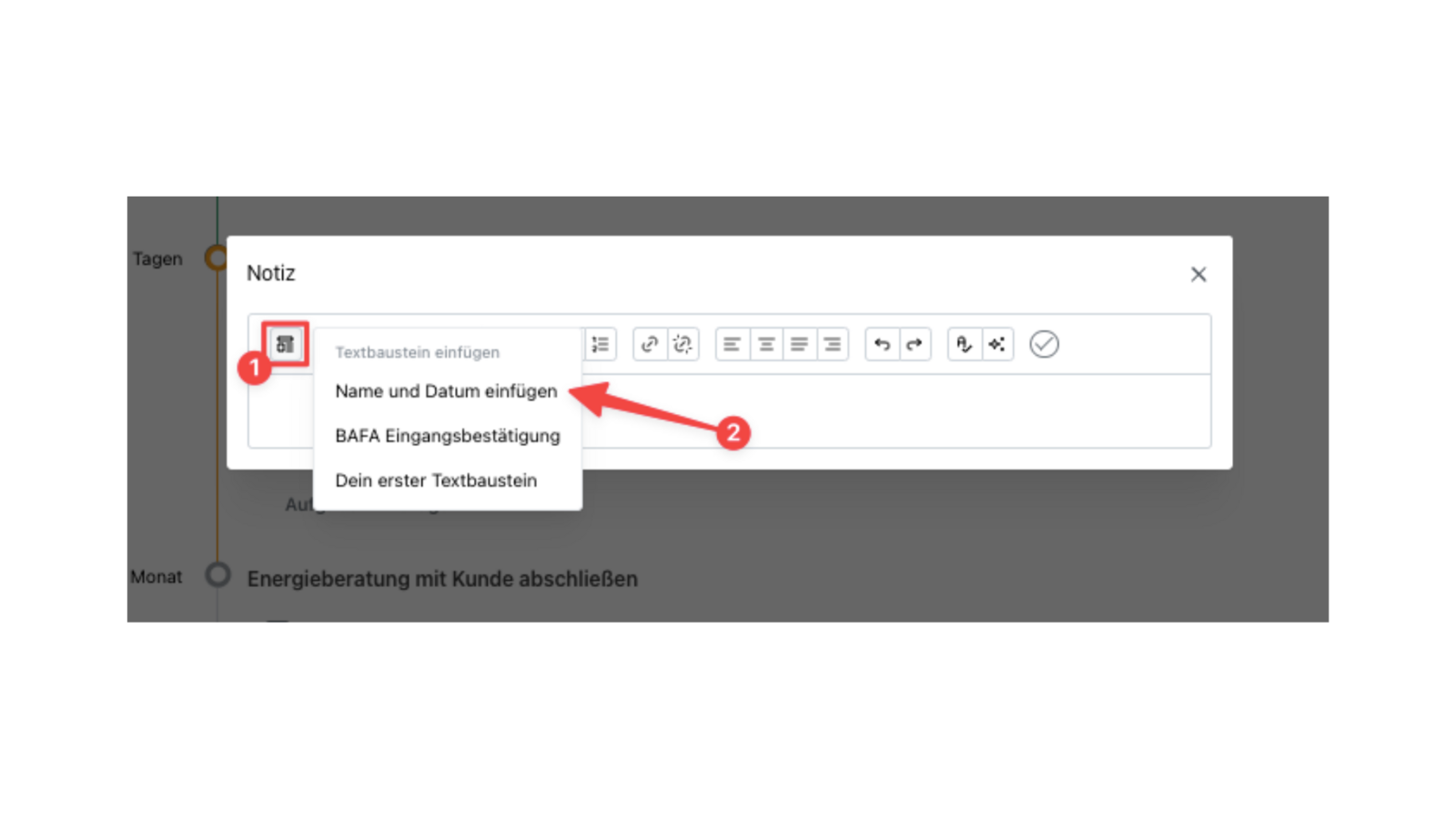 Wenn es dir wichtig ist zu wissen, wann die Notiz erstellt wurde und von wem, kannst du auf das markierte Symbol klicken. Dort kannst du dann "Name und Datum einfügen" auswählen, um den Namen und das Datum der Notiz automatisch zu hinterlegen.