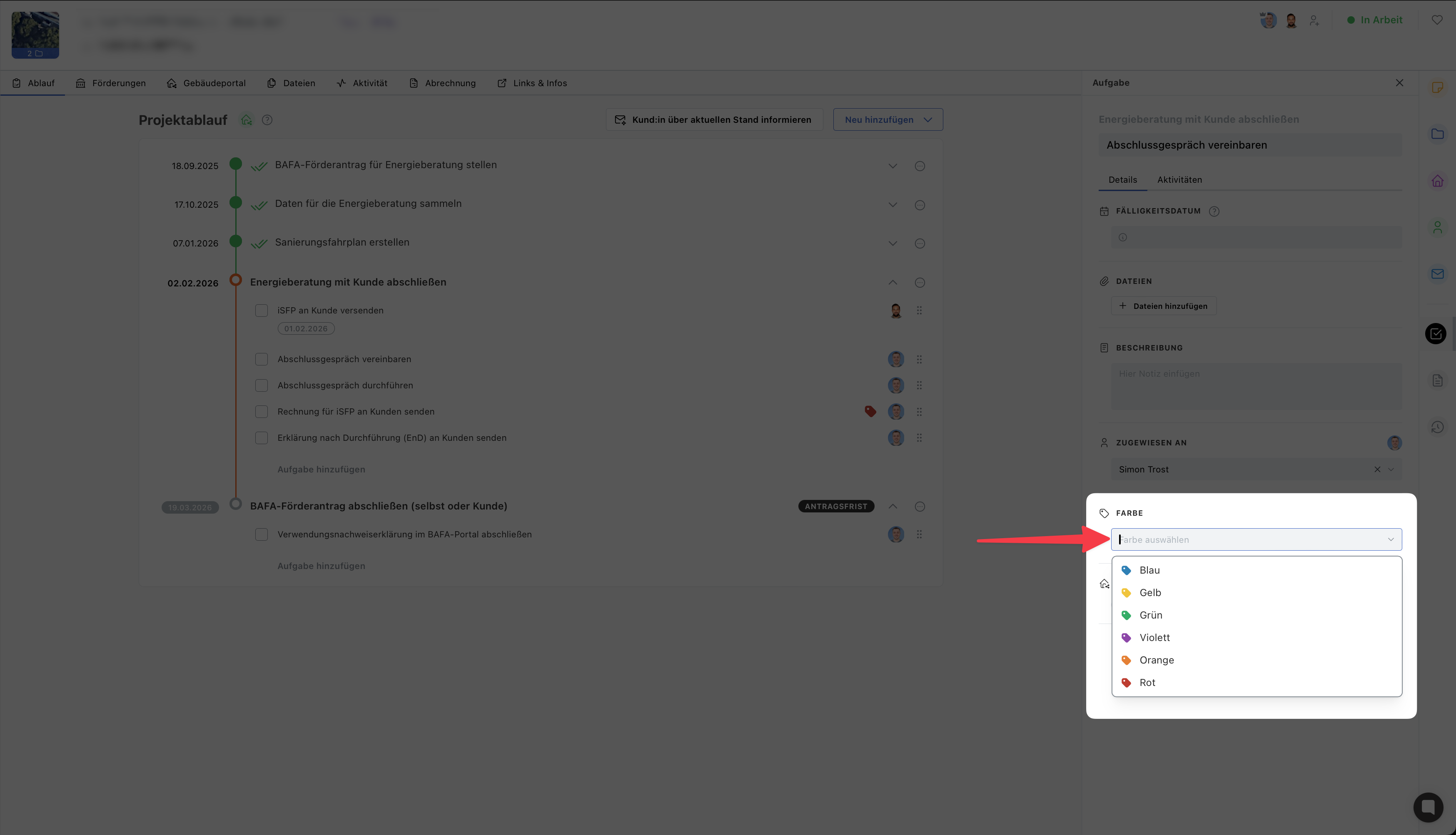 Wähle auf der rechten Seite im geöffneten Fenster unter „Farbe“ eine Farbe aus, die die Wichtigkeit der Aufgabe widerspiegelt.