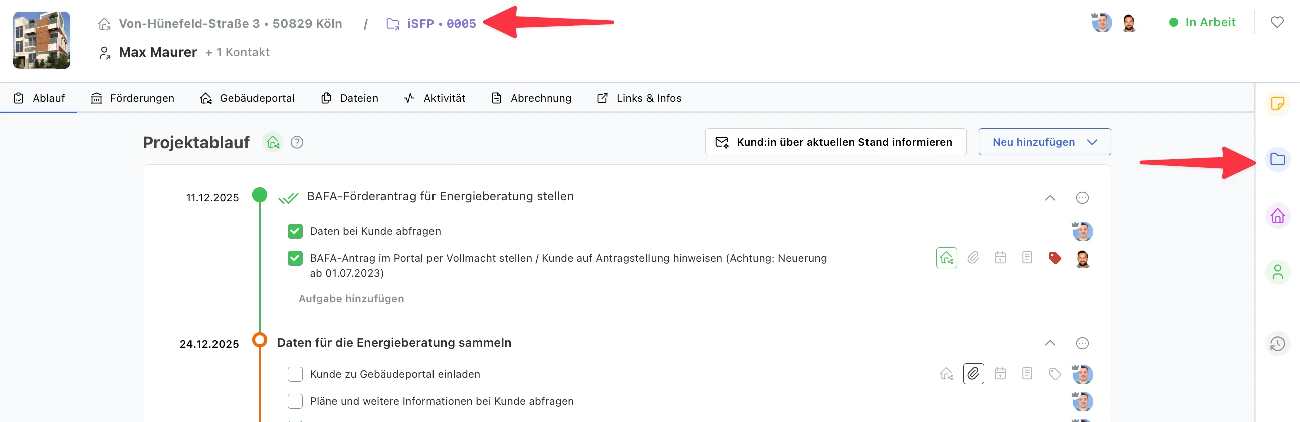 Beim Anlegen eines neuen Projekts vergibt das System automatisch die nächste freie Projektnummer. Du musst dir nicht merken, welche Nummer zuletzt verwendet wurde – die Ermittlung erfolgt vollständig im Hintergrund. Das System prüft dazu die zuletzt vergebene Projektnummer, erkennt die darin enthaltene Ziffernfolge und erhöht diese um eins. Der übrige Teil der Bezeichnung bleibt unverändert.