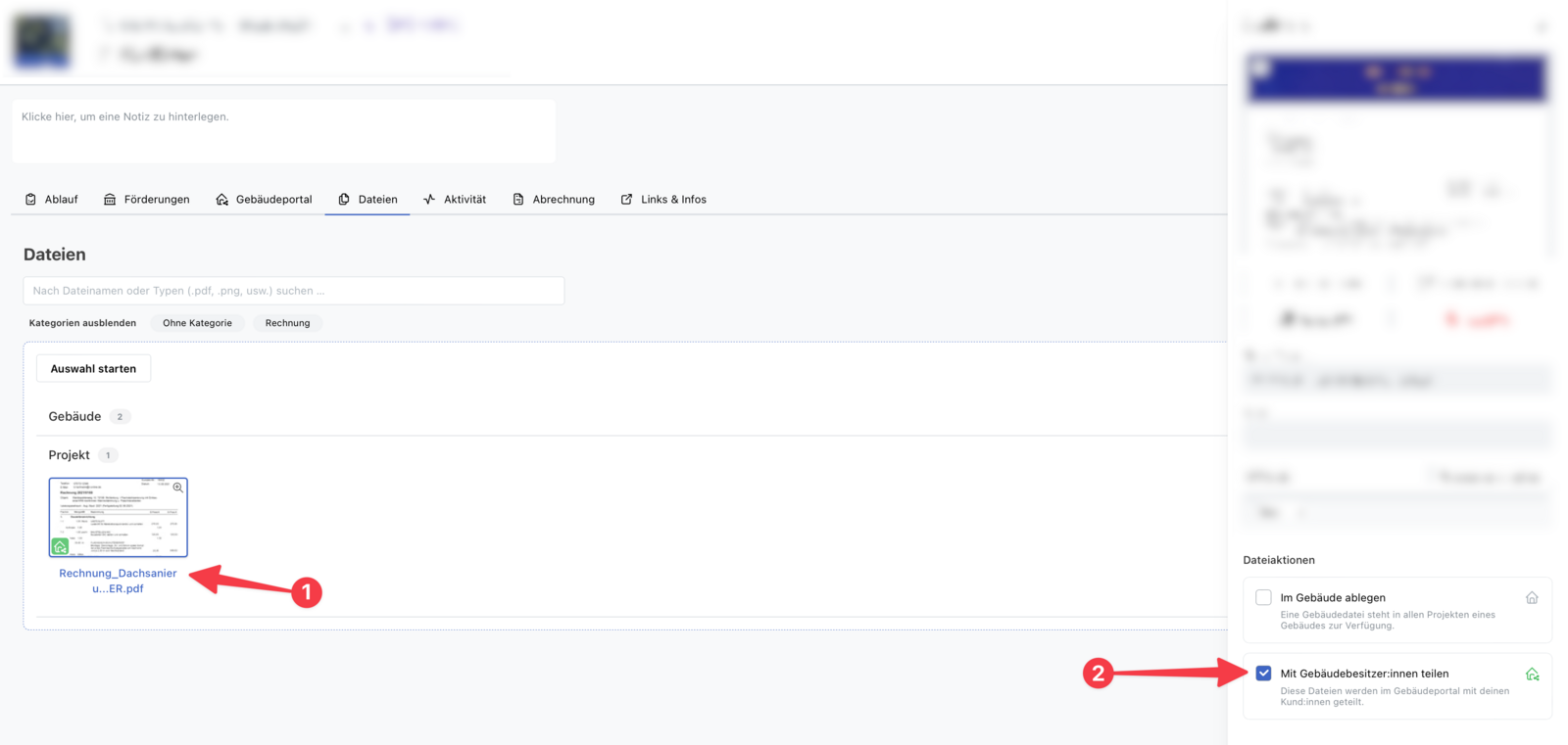Anschließend öffnet sich ein kleines Fenster, wo du "Mit Gebäudebesitzer:innen teilen" anklicken musst, um die entsprechenden Dateien über das Gebäudeportal zu teilen.