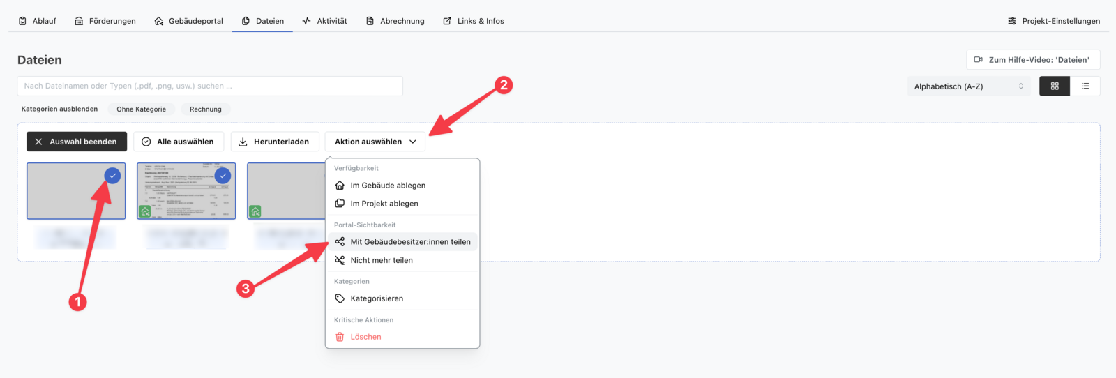 Nachdem du die Dateien markiert hast die über das Gebäudeportal geteilt werden sollen, klicke auf "Aktion auswählen".
