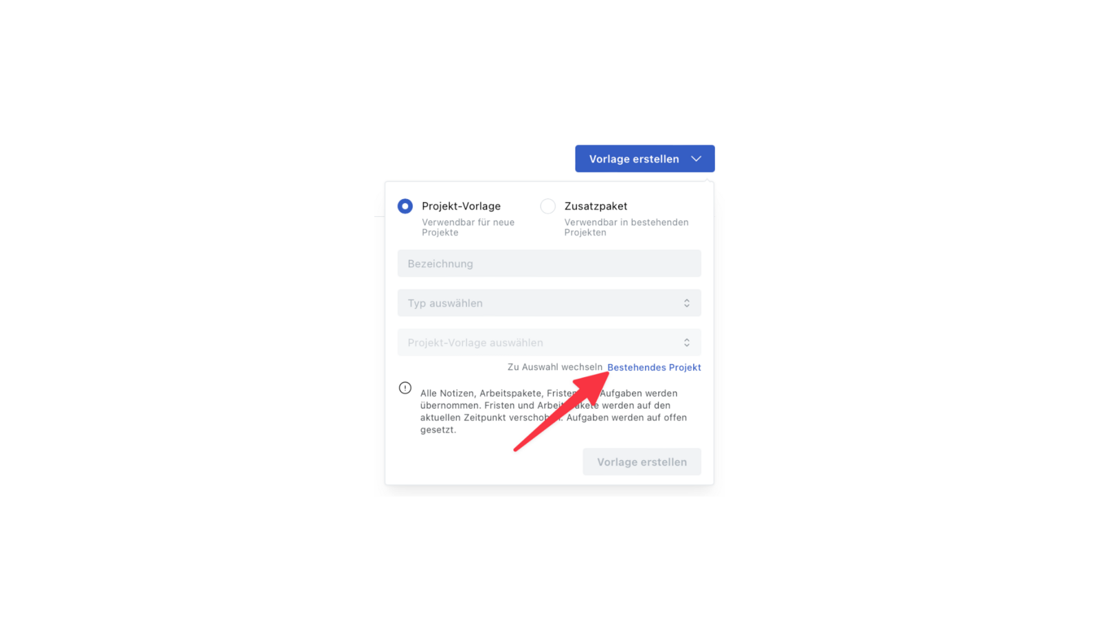 Wähle bei "Zu Auswahl wechseln" die Option "Bestehendes Projekt".