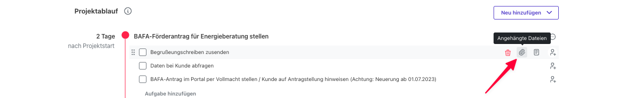 Um eine Datei zu einer Aufgabe hinzuzufügen, gehe zu einer Projektvorlage oder einem Projektablauf.
