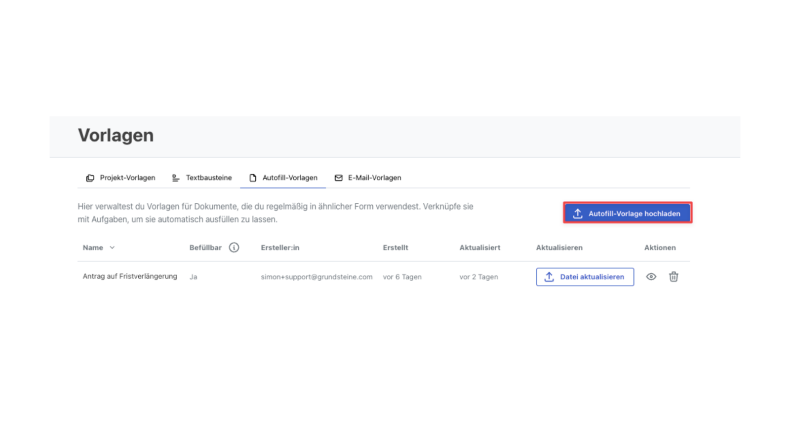 Klicke auf das markierte Symbol einer Aufgabe und füge eine Datei hinzu, die du zuvor unter "Autofill-Vorlagen hochladen" hochgeladen hast.