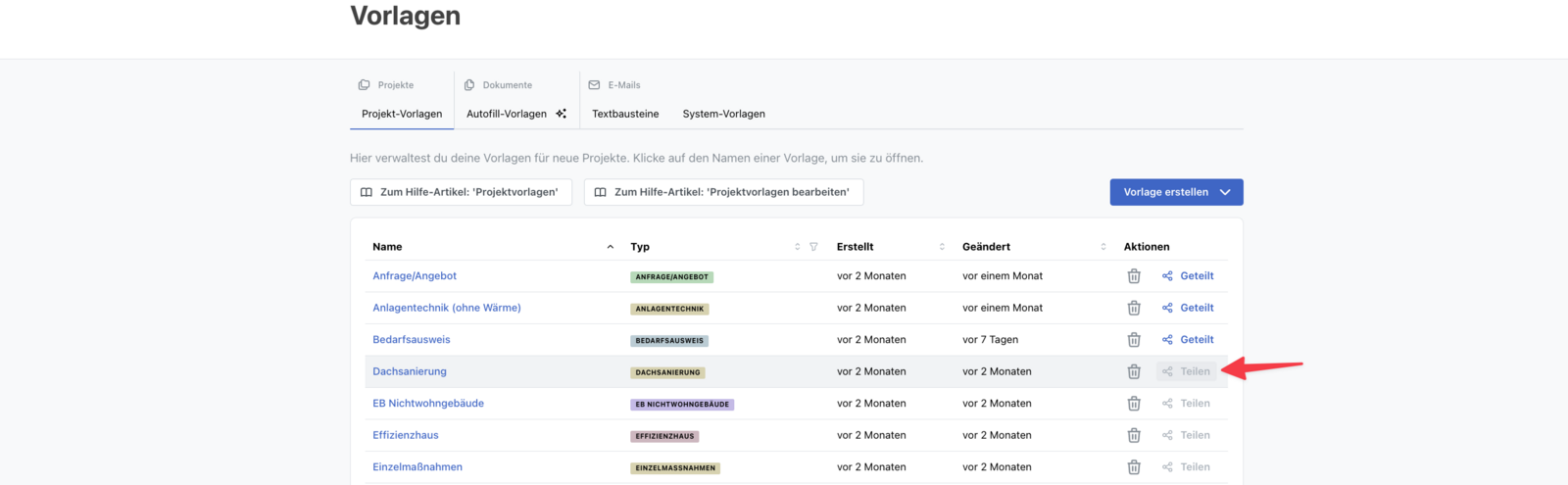 Gehe im Bereich "Projekt-Vorlagen" auf die rechte Seite unter "Aktionen" und klicke auf den Button "Teilen" von der Vorlage, die du teilen möchtest.