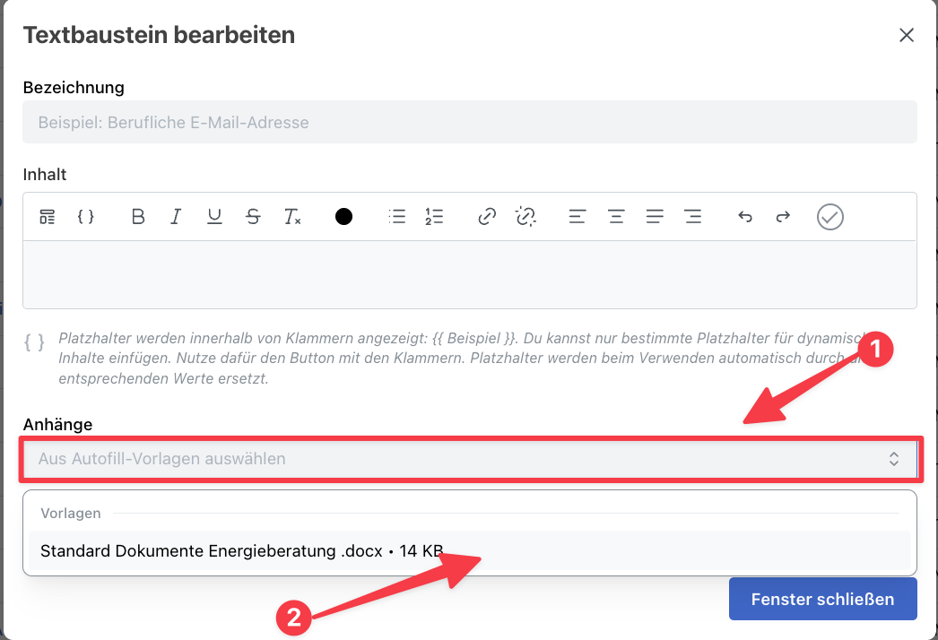 Klicke auf das Feld "Anhänge" und wähle die Dateien aus, die mit der Verwendung des Textbaustein angehängt werden sollen (siehe Abbildung 1).