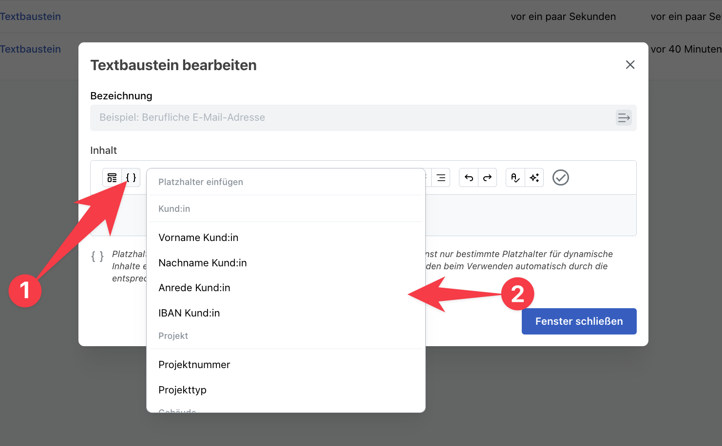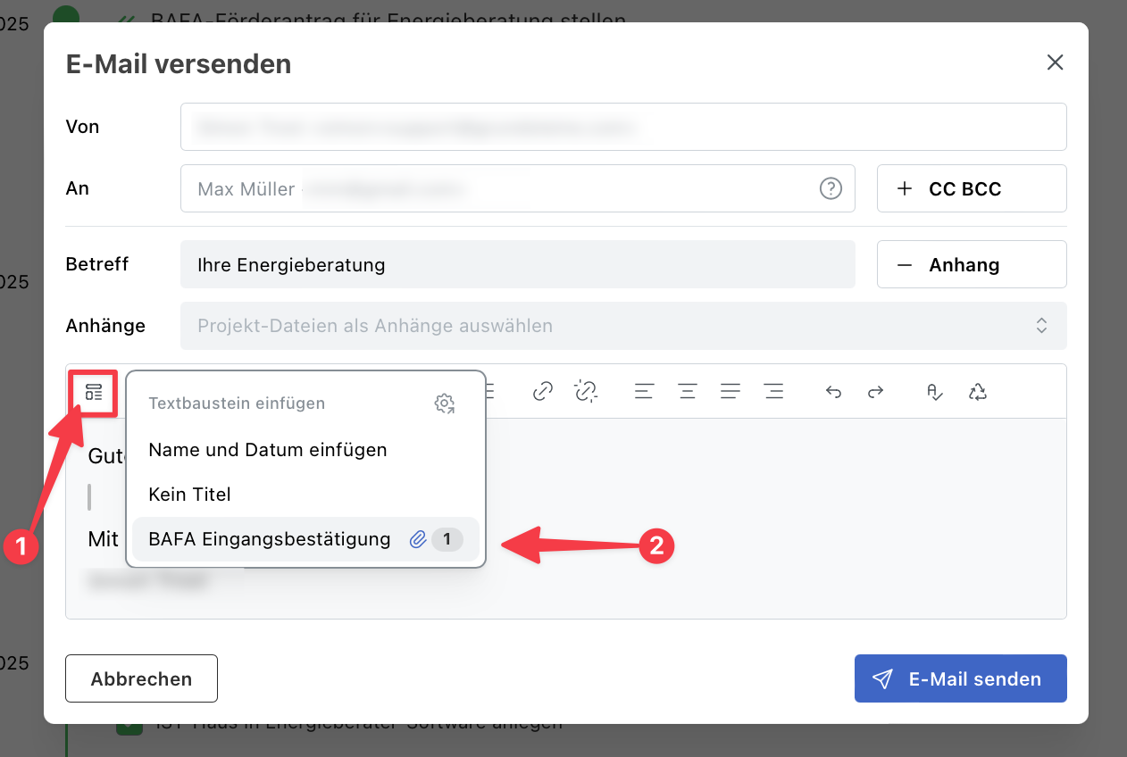 Nun kannst du Textbausteine in E-Mails einfügen wie in Abbildung 2 gezeigt.
