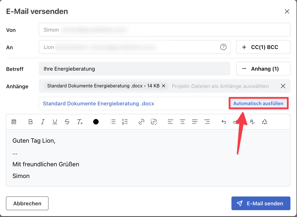 Nachdem die Datei automatisch ausgefüllt wurde, steht hinter dem Dateinamen "Automatisch ausgefüllt". Dann kannst du die E-Mail mit der Datei versenden.
