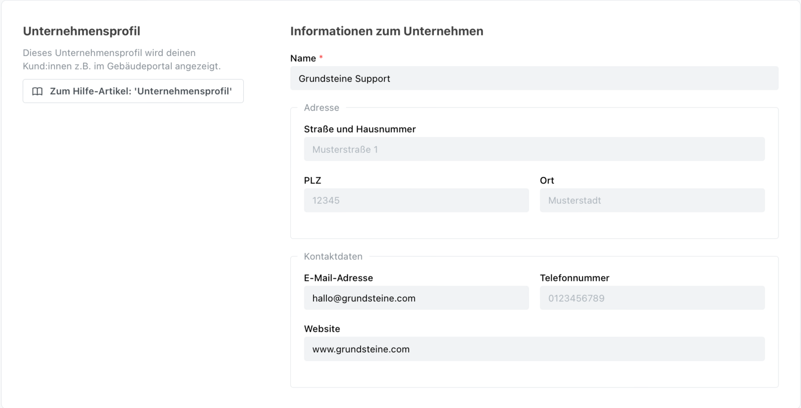 Füge eine E-Mail-Adresse, deine Telefonnummer und weitere Daten hinzu, die der Kunde im Gebäudeportal sehen soll.